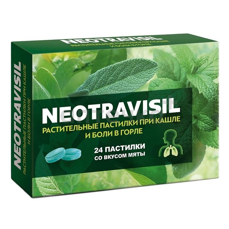 Пастилки NEOTRAVISIL рекомендуются в качестве биологически активной добавки к пище - источника ментола, содержащие эфирные масла, способствует снижению риска развития острых и хронических воспалительных заболеваний дыхательных путей, сопровождающихся кашлем (фарингит, ларингит, в том числе «лекторский», трахеит, бронхит) и болью в горле.