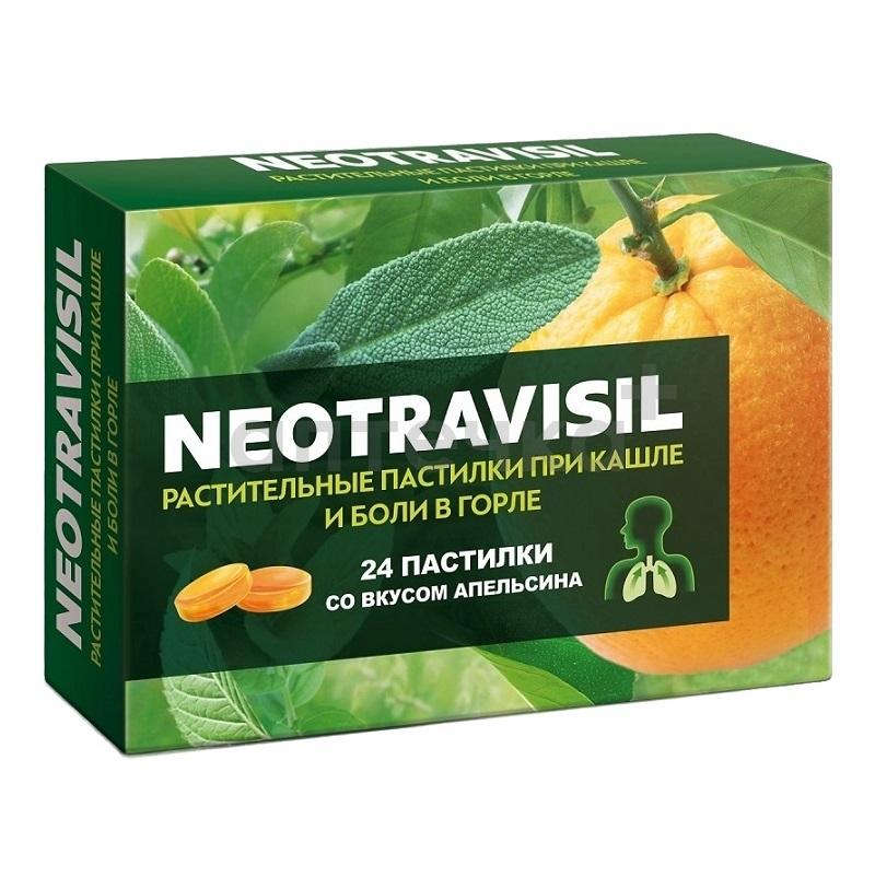 Пастилки NEOTRAVISIL рекомендуются в качестве биологически активной добавки к пище - источника ментола, содержащие эфирные масла, способствует снижению риска развития острых и хронических воспалительных заболеваний дыхательных путей, сопровождающихся кашлем (фарингит, ларингит, в том числе "лекторский", трахеин, бронхит) и болью в горле. Содержат инновационную комбинацию из 4 экстрактов лекарственных трав: солодки, эвкалипта, коричника камфорного, мяты, а также экстракт плодов апельсина, которые, благодаря комплексному эффекту компонентов, обеспечивают двойное действие: помогают при кашле и боли в горле.