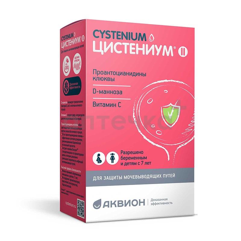 Цистениум II в качестве биологически активной добавки к пище - дополнительного источника витамина С, содержащей проантоцианидины. Цистениум II не просто устраняет симптомы, а воздействует непосредственно на причину возникновения цистита, предотвращая прикрепление бактерий к стенкам мочевого пузыря.