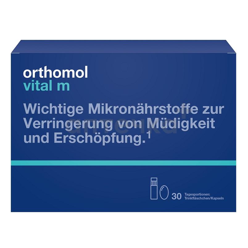 Ортомоль Витал м рекомендуется в качестве биологически активной добавки к пище для мужчин - источника ПНЖК омега-3, экозапентаеновой кислоты, докозагексаеновой кислоты, каротиноидов, дополнительного источника витаминов (А, Д3, Е, К, С, В1, В2, В6, В12, никотинамид, фолиевая кислота, пантотеновая кислота, биотин) и минеральных веществ (магний, цинк, железо, медь, селен, марганец, хром, йод), применяется при повышенных физических, эмоциональных и психических нагрузках, синдроме хронической усталости.